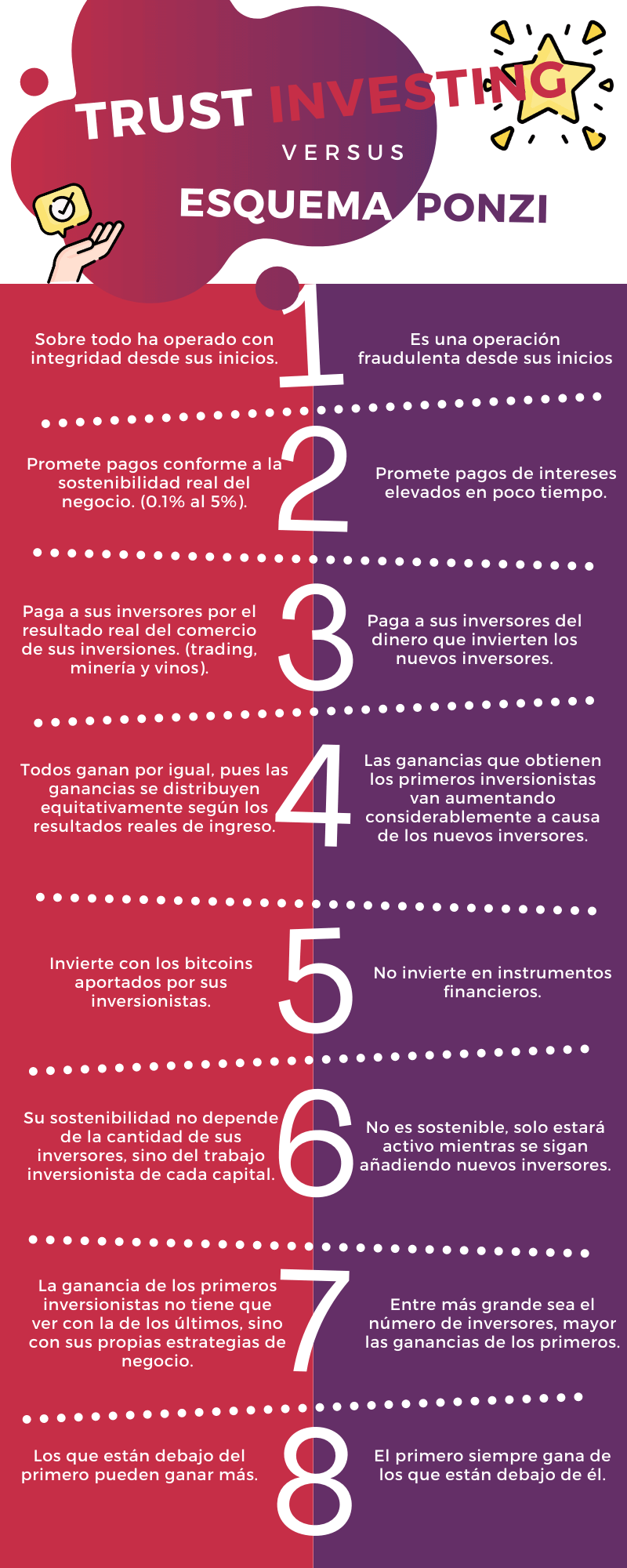 Seguramente escucharas en YouTube y algunas páginas web que Trust Investing es un “esquema Ponzi”, y es que la verdad, estas personas, o no están informadas, o utilizan el marketing para que su artículo publicado tenga más visitas, usan diferentes técnicas como el gap de la curiosidad (Ejemplo: “Será Trust Investing una estafa”) para luego decirle al público lo que quieren oír, ellos obtienen like, atención y tú te quedas sin un proyecto para lograr tu libertad financiera.
